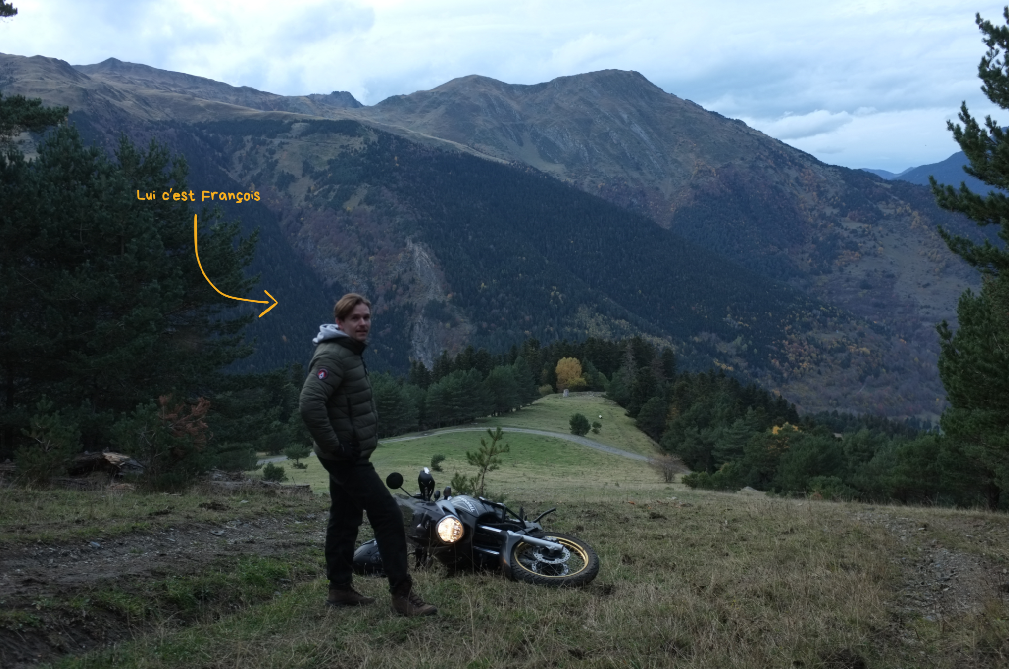 On se lance dans la trace, c’est la première fois pour François en off-road et il s’en sort vachement bien. Le chemin est roulant, pas trop gras. On monte et on en prend plein les yeux. On conjure le sort en repassant la grimpette sans rien casser cette fois-ci et on finit par arriver en haut. On salut la Santa de Betren, c’est magnifique. Le chemin devient de plus en plus technique et le soleil étant presque couché, on décide d’entamer la redescente et on finit de nuit le retour. Il est 19 h, on est morts : une soupe, une pipe et au lit !