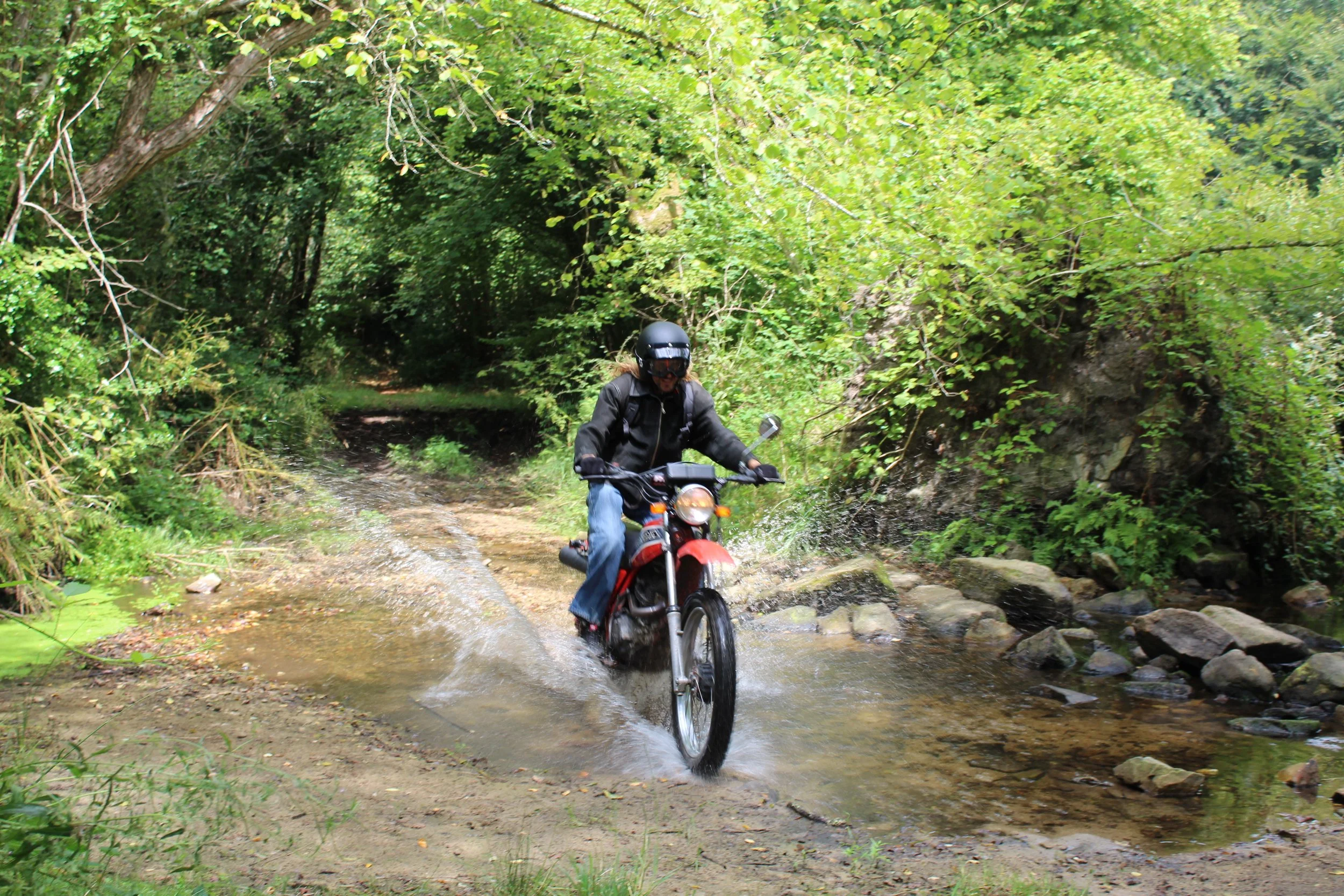En suivant Paul-Alexis sur la route, avec ses cheveux longs qui dépassent du casque et prennent le vent, j’ai l’impression d’être en plein clip de rock. Même si la 125 XLS montre rapidement ses limites sur les routes secondaires, elle reste malgré tout très sécurisante et facile. Paul-Alexis m’emmène ensuite dans de nouveaux chemins qu’il avait repérés et qu’il voulait tester. Et bien, autant vous dire qu’on ne s’est pas ennuyés : passage de ruisseau, grimpette, descente, embourbement, cul-de-sac… On a eu la totale, pour notre plus grand plaisir !